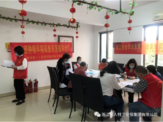 活動前三天,獵人特衛安保集團黨支部黨員及入黨積極分子主動請纓,要求配合送醫下社區團隊為活動全程提供志愿服務,為早篩活動盡自己的一份微薄之力。活動當天,獵人特衛志愿者們提前趕到檢查現場,早早地擺好桌椅,并主動向在場醫生及護士了解服務指南。志愿服務團隊按照分工,指導或幫助早篩業主填寫早篩檢查同意書、有條不紊地為業主測體重、量身高、腰圍及數值記錄、早篩程序引導、答疑解惑等,隨處可見到她們忙碌的身影。現場參加早篩的居民越來越多,她們這身上的那抹獨特的“志愿紅”更顯得搶眼。