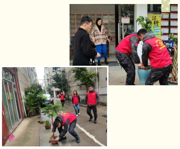 黨員志愿者們幫忙把門前的綠植搬進商鋪里
