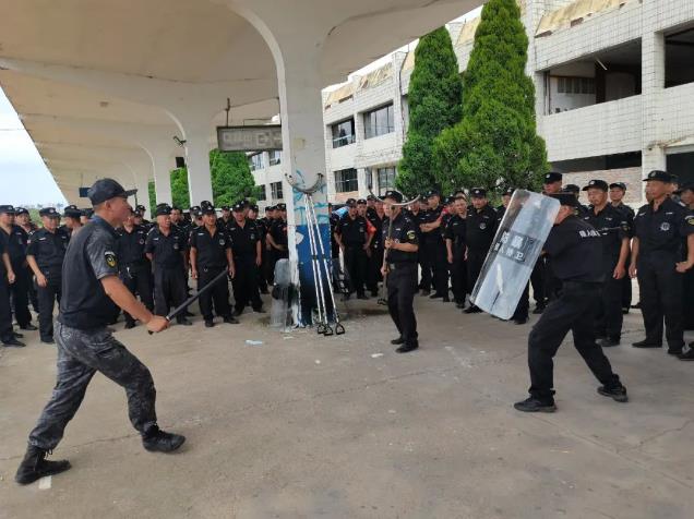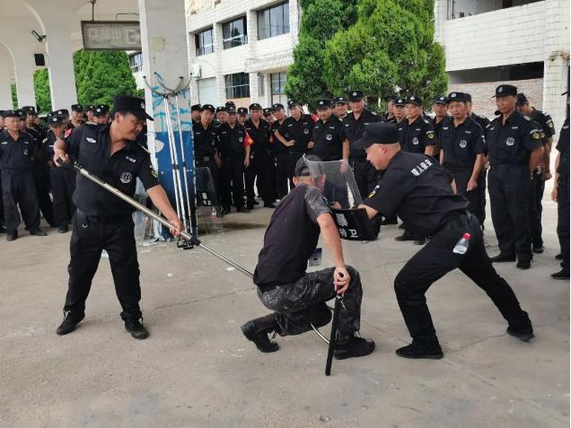 培訓為期4天,分兩個批次輪換組訓。培訓內容包括隊列體能、著裝儀態、文明用語、防詐反詐、守護防護、隱患排查、避險逃生、急救報警,以及校園發生暴恐事件的應急處置等各項基本知識和技能。特別是對防暴器材“八大件”使用進行了細致深入講解,組織保安員逐人分組對防暴盾牌、鋼叉、腳叉、頸叉、警棍、噴霧器、消防滅火器等器材進行了反復練習。